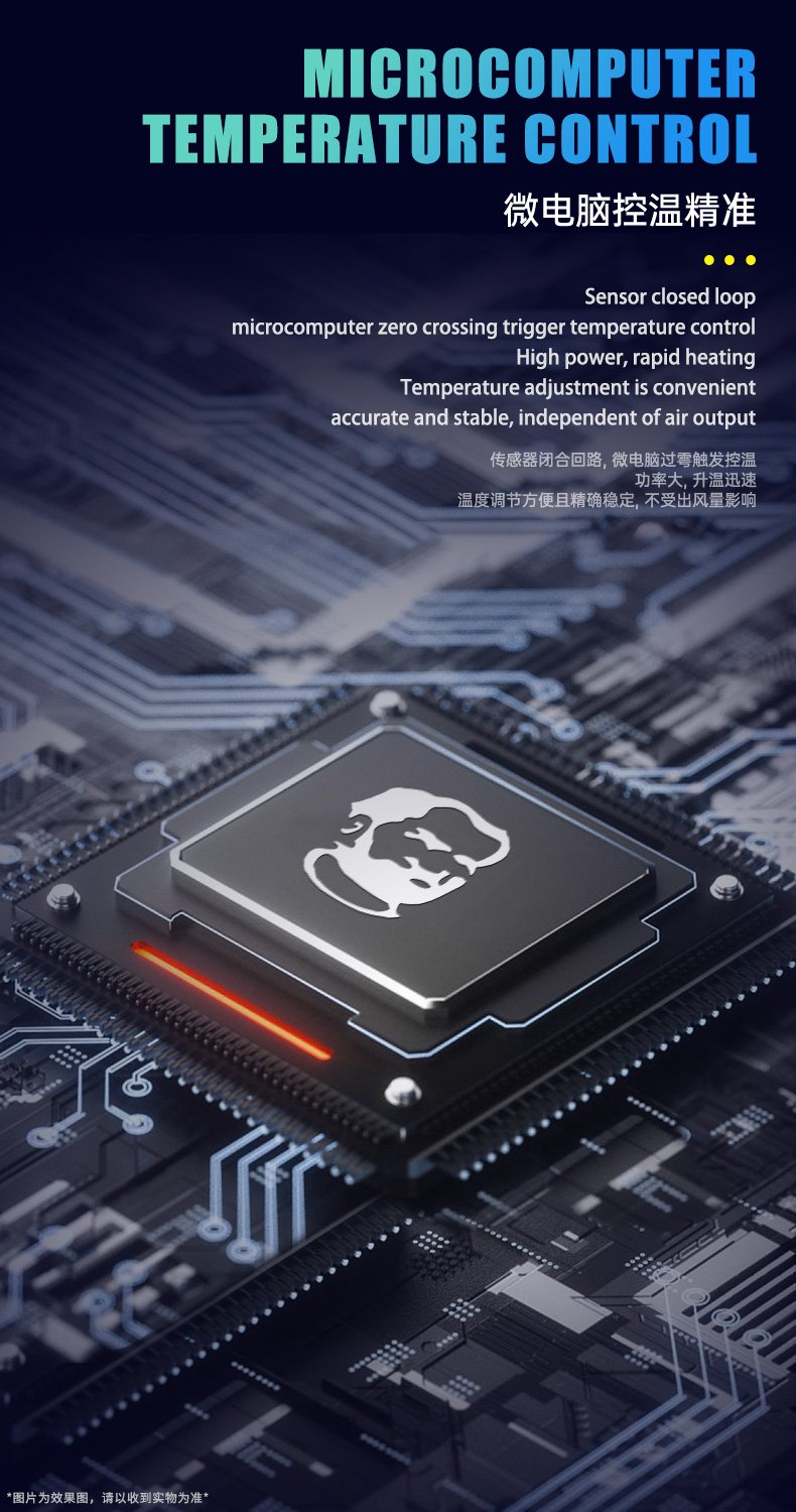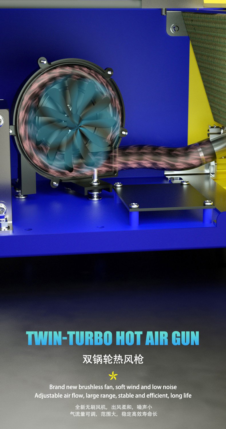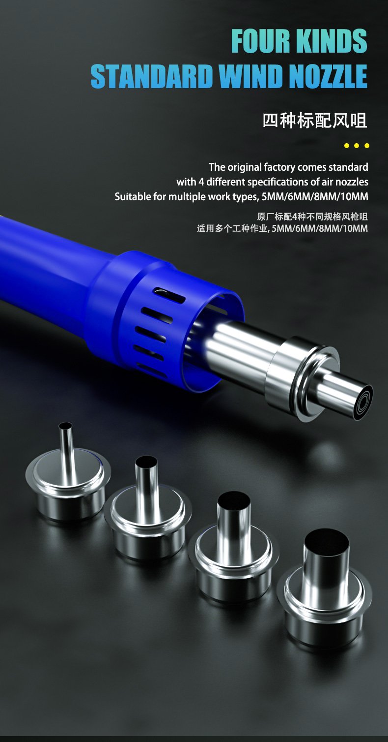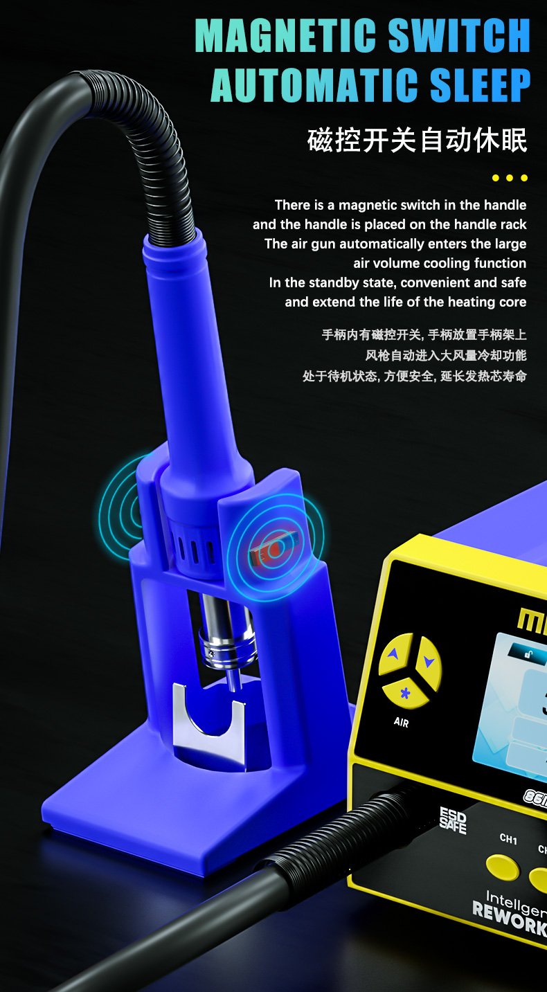 • Pistolet à air chaud double turbine, faible bruit et mise en veille automatique via le capteur magnétique
