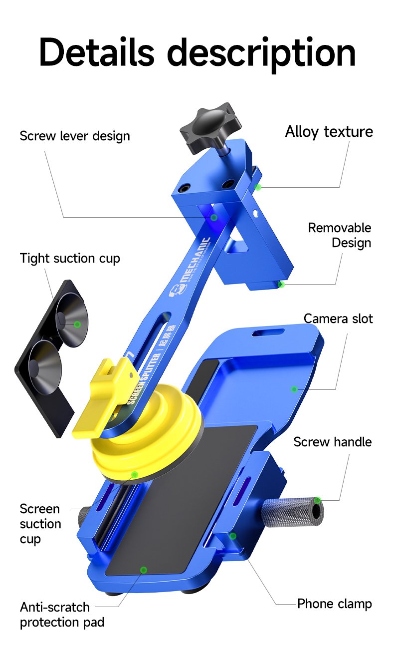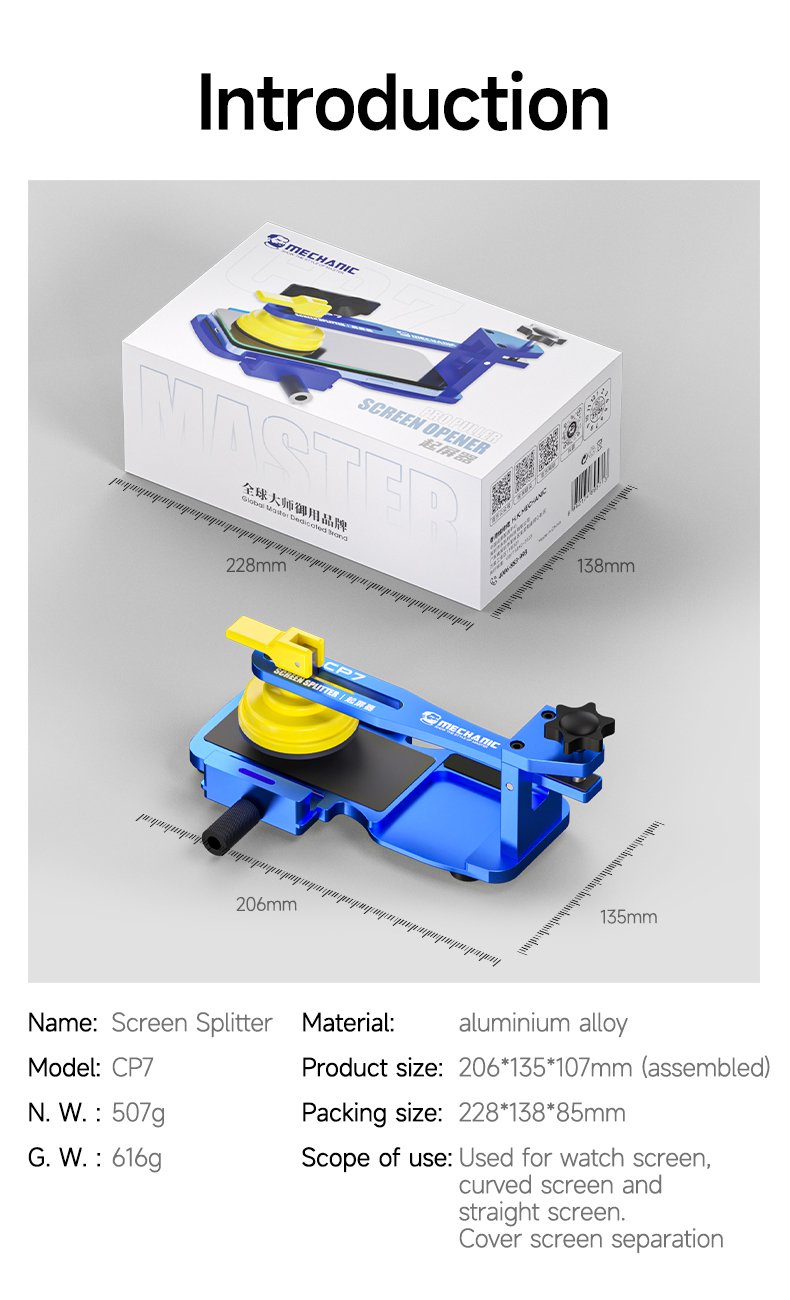 le MECHANIC CP7 est un kit multifonctionnel conçu pour la séparation rapide des écrans LCD de téléphones et tablettes, sans besoin de chauffage. Il s’agit d’une pince universelle de haute qualité, idéale pour les écrans plats, incurvés ou recouverts, ainsi que pour les dos vitrés.