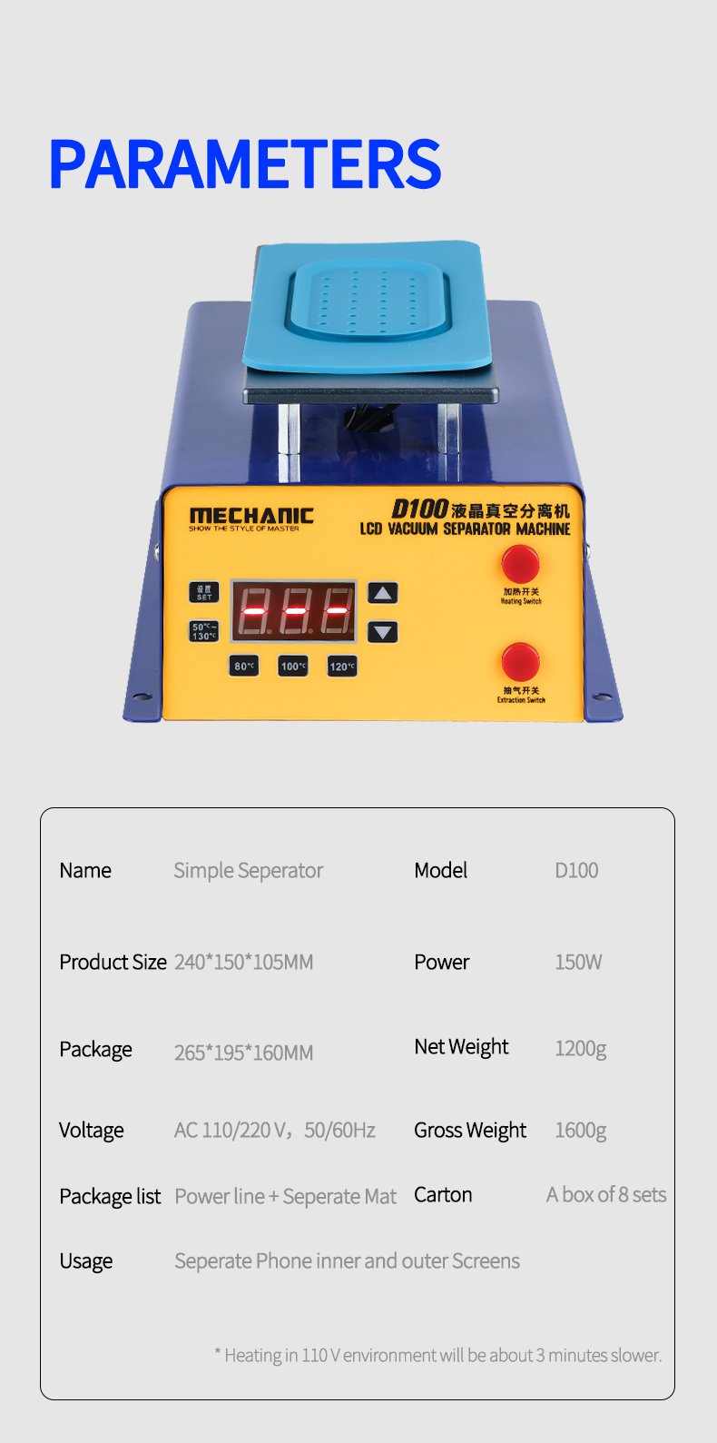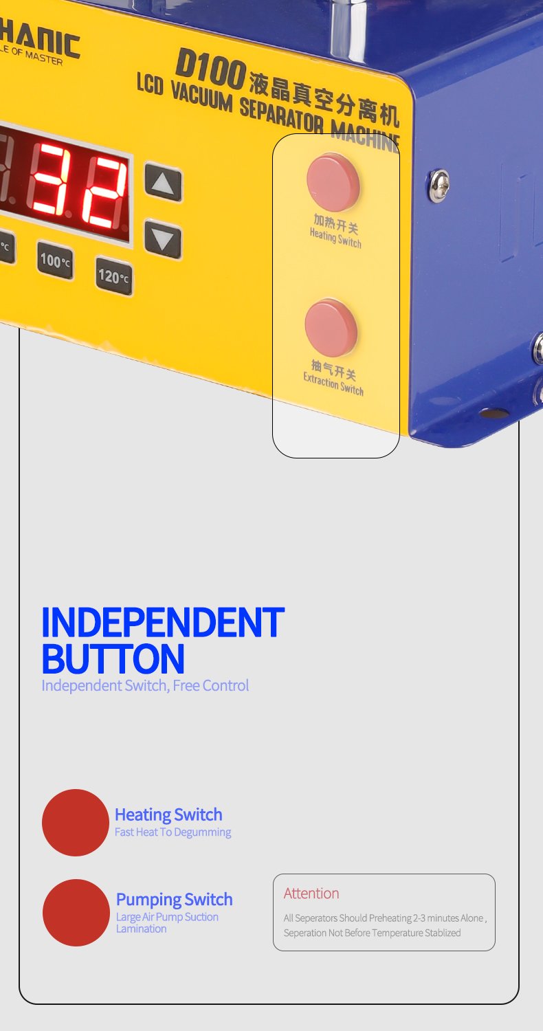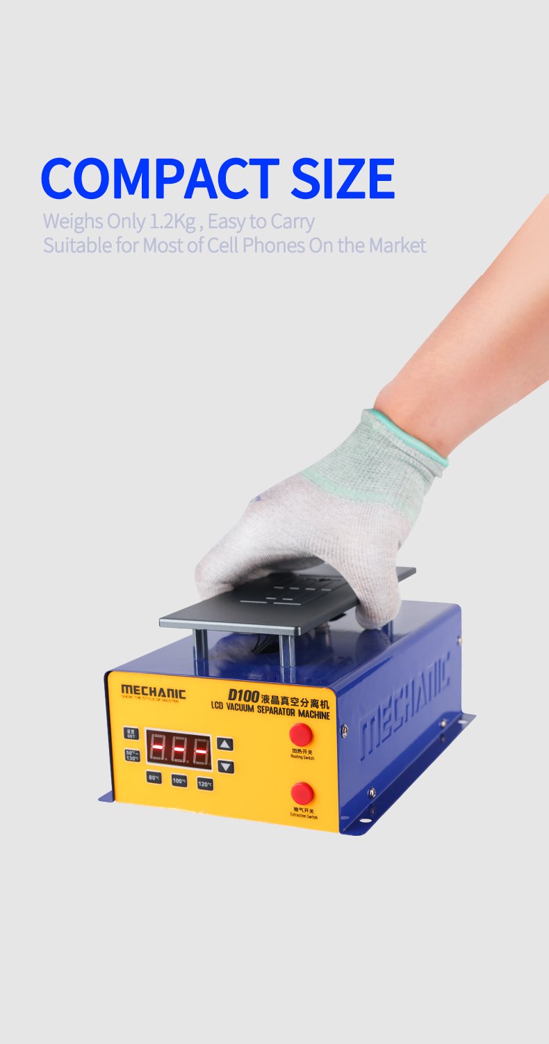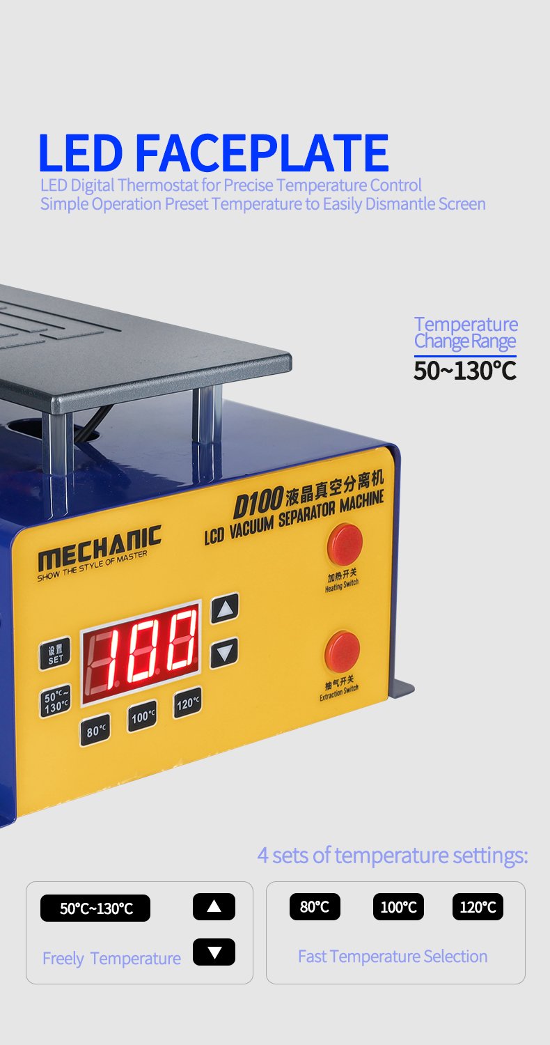 Le séparateur d’écran LCD MECHANIC D100 est conçu pour le retrait et la réparation rapide des écrans tactiles de téléphones et tablettes. Il dispose d’un plateau chauffant puissant, avec contrôle numérique LED et quatre préréglages de température, permettant un préchauffage précis des écrans. La pompe à vide intégrée assure une fixation solide grâce à une forte aspiration, tandis que la structure compacte et le plateau en aluminium garantissent sécurité et stabilité pendant l’opération. Le modèle D100 est adapté aux écrans jusqu’à 7 pouces