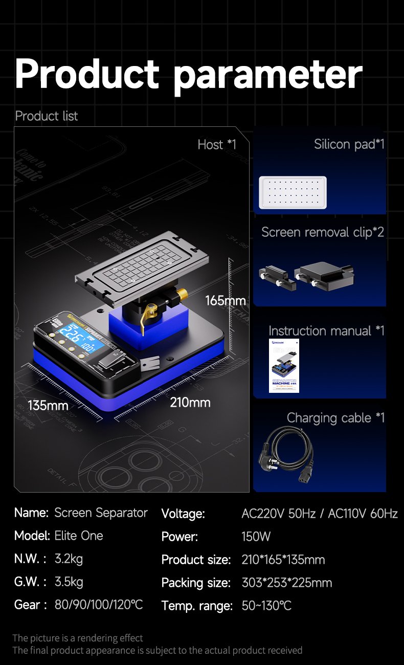 Le séparateur rotatif Elite One permet de démonter facilement écrans plats, incurvés ou pliables grâce à sa rotation à 360° et sa grande plaque chauffante. Il dispose d’un panneau numérique pour contrôler la température en temps réel, d’une base stable, et d’une pompe à air puissante pour une aspiration solide. Son chauffage rapide et précis assure un démontage sûr et efficace sans endommager l’écran.