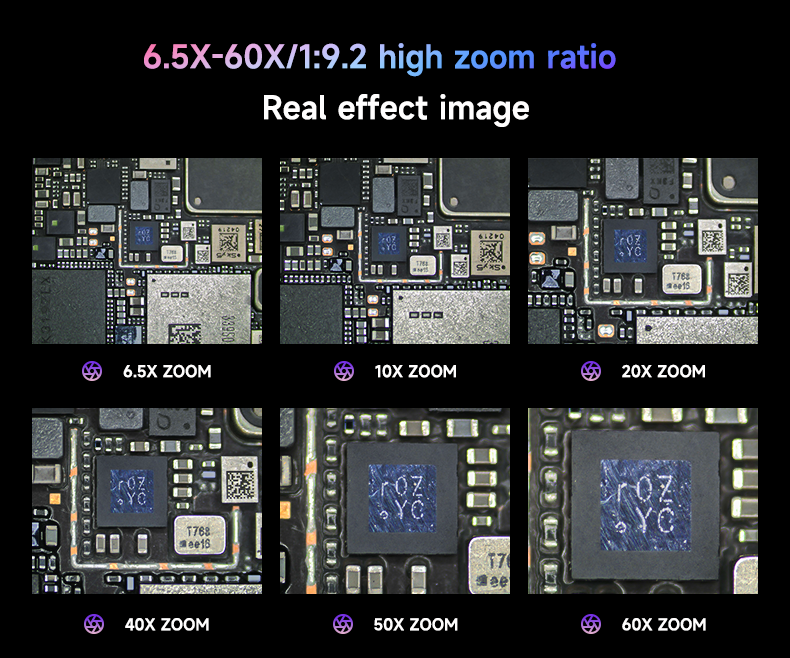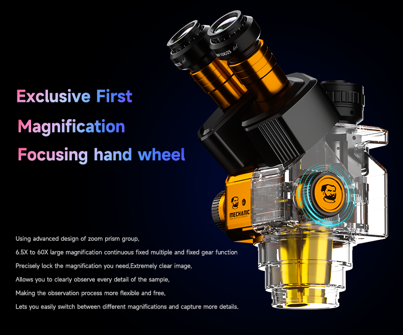 Le microscope trinoculaire MECHANIC ROBOT Z4 dispose d’un oculaire réglable de 6,5X à 60X pour un grossissement HD, idéal pour la soudure de cartes mères de téléphones et les travaux de précision.